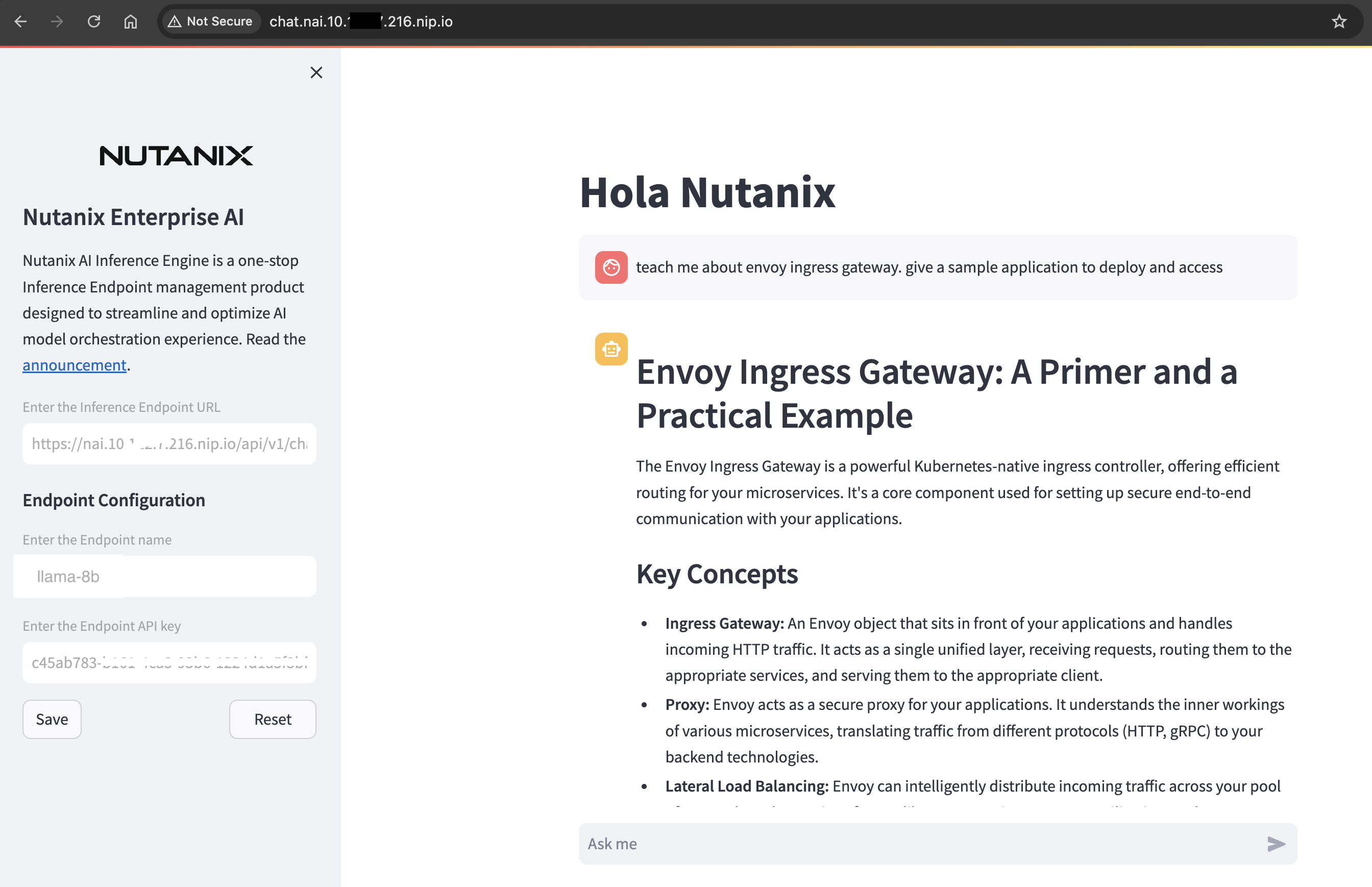 kubectl apply -f -<<EOF apiVersion: gateway.networking.k8s.io/v1 kind: HTTPRoute metadata: name: nai-chatapp-route namespace: chat # Same namespace as your chat app service spec: parentRefs: - name: nai-ingress-gateway namespace: nai-system # Namespace of the Gateway hostnames: - "chat.nai.10.x.x.216.nip.io" # Input Gateway IP address rules: - matches: - path: type: PathPrefix value: / backendRefs: - name: nai-chatapp kind: Service port: 8502 EOF -