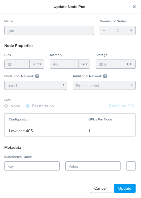 PCVM:~$ karbonctl cluster node-pool add --cluster-name dev-cluster --count 2 --cpu 12 --memory 40 ---disk-size 300 -gpu-count 1 --gpu-name "Lovelace 40S" --node-pool-name gpu