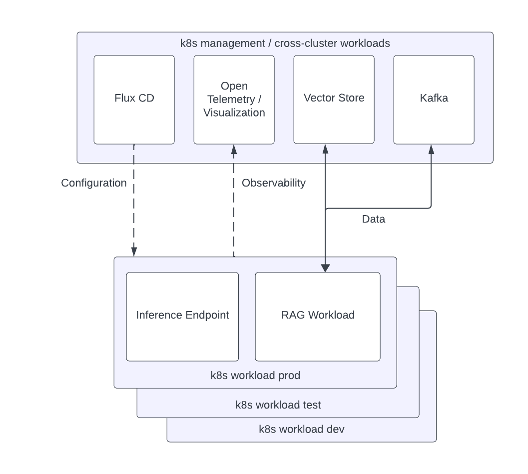 - Kafka: Provides messaging infrastructure to send and receive data from the Retrieval-Augmented Generation (RAG) workload and vector database store