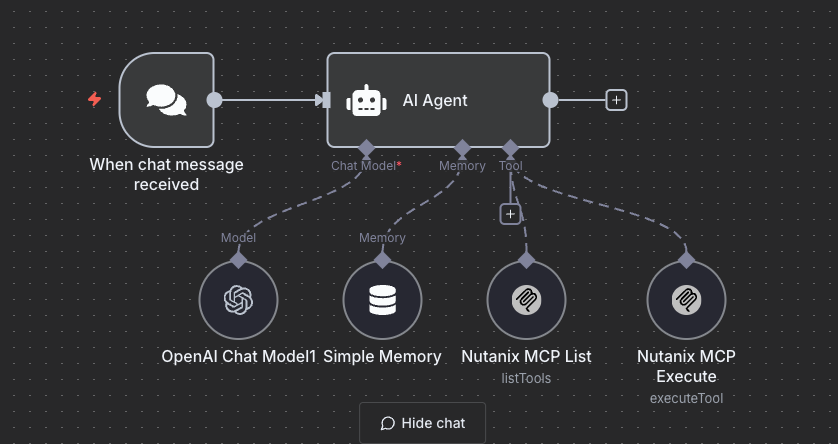 This workflow is a simple example of how to use the MCP server for Nutanix in an N8N workflow. It uses the AI Agent node to interact with the MCP server via the MCP Client node. In the following workflow, we'll be using the n8n-nodes-mcp community node to interact with the Nutanix MCP server.