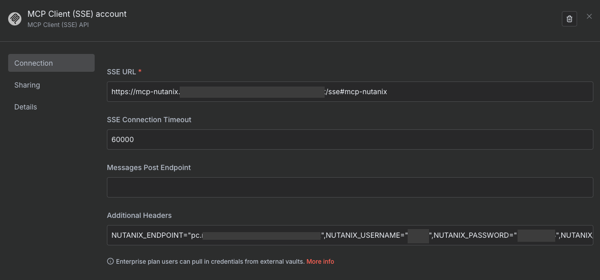 6. For Credentials - create New Credential and Configure MCP Client node to use the Nutanix MCP server SSE endpoint